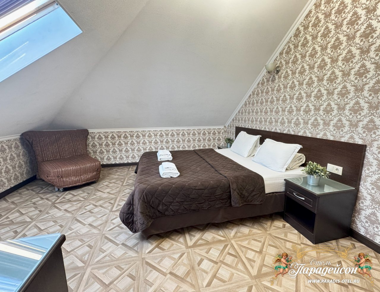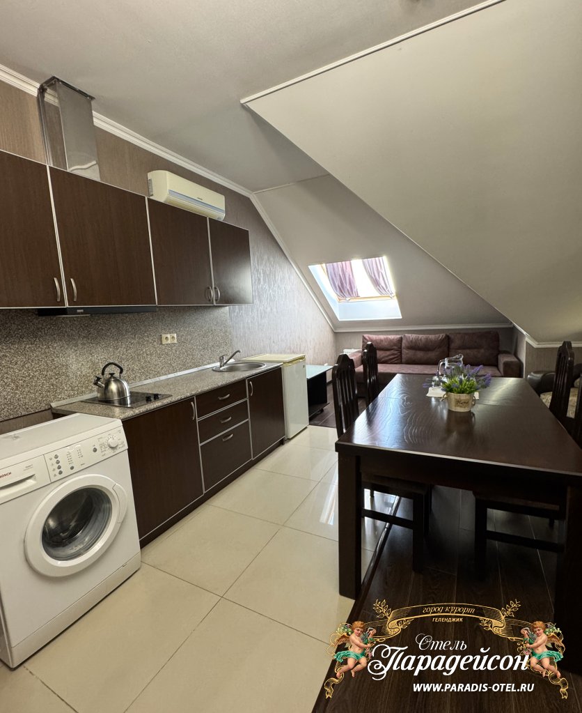 Двухкомнатные просторные апартаменты с собственной кухней расположены на четвертом мансардном этаже отеля и вмещают до 5-ти человек. Общая площадь апартаментов 48 м2, состоят из гостиной, спальни, санузла. Гостиная оснащена кухней, укомплектованной необходимой посудой для самостоятельного приготовления, обеденной группой, двуспальным диваном, раскладным креслом, мини-холодильником. В спальне размещены: двуспальная кровать с ортопедическим матрасом, тумбочки, комод, большое зеркало. В каждой комнате имеется телевизор и сплит система, также установлен сейф и вместительный шкаф для одежды. Номер укомплектован постельным бельем, полотенцами, тапочками. В ванной комнате, укомплектованной феном и набором туалетно-косметических принадлежностей, установлен душ. На верхние этажи можно подняться только по лестнице.