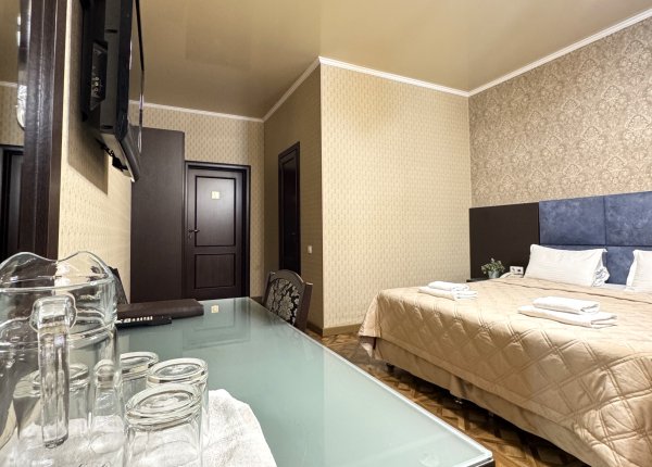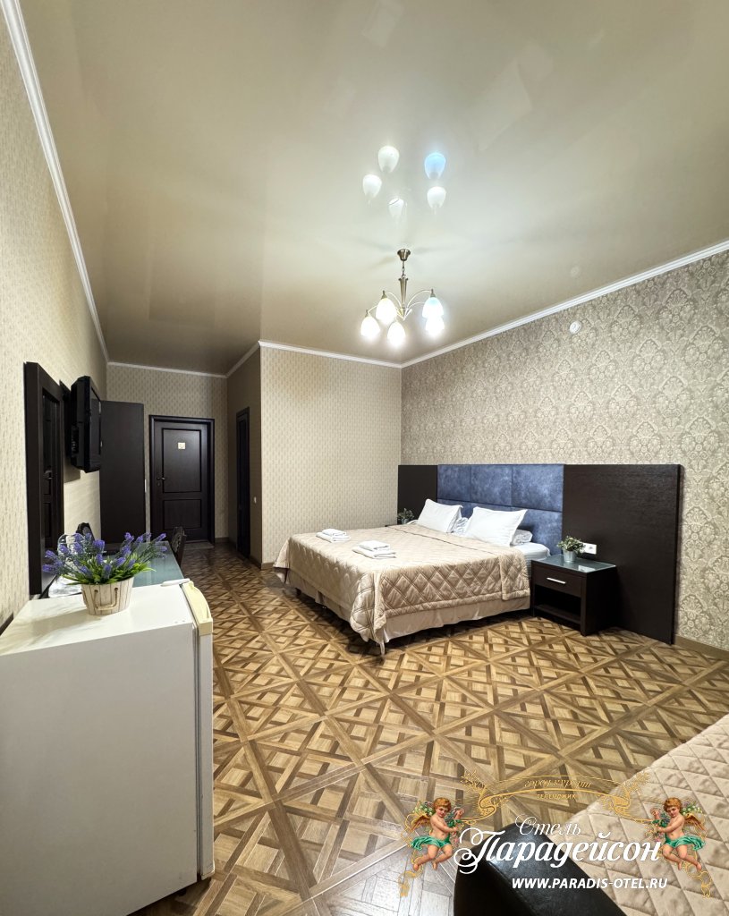 Просторный семейный номер расположен на цокольном этаже и вмещает до 4х человек. Состоит из комнаты и санузла (общая площадь 32 м2). Номер оснащен всеми удобствами для комфортного отдыха - двуспальной кроватью с ортопедическим матрасом, двуспальным диваном, тумбочками, шкафом для одежды, письменным столом, зеркалом, мини-холодильником, кондиционером, телевизором с плоским экраном, сейфом. Номер укомплектован постельным бельем, полотенцами, тапочками. В ванной комнате, укомплектованной феном и набором туалетно-косметических принадлежностей, установлен душ или ванна.