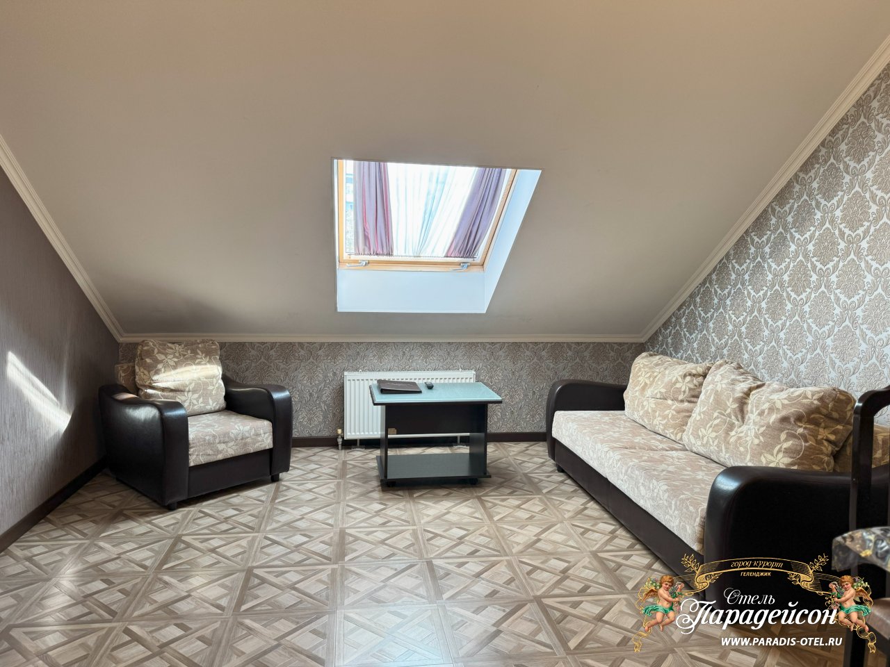 Трехкомнатные просторные апартаменты с собственной кухней расположены на мансардном четвертом этаже отеля и вмещают до 7-ми человек. Общая площадь апартаментов 72 м2, состоят из гостиной, двух спален и санузла. Гостиная оснащена кухней, укомплектованной необходимой посудой для самостоятельного приготовления, обеденной группой, двуспальным диваном, стиральной машиной, мини-холодильником. В спальнях размещены: двуспальные кровати с ортопедическими матрасами, раскладное кресло, тумбочки, письменный стол, комод, зеркало. В каждой комнате имеется телевизор и сплит система, также установлен сейф и вместительный шкаф для одежды. Номер укомплектован постельным бельем, полотенцами, тапочками. В ванной комнате, укомплектованной феном и набором туалетно-косметических принадлежностей, установлена ванна. На верхние этажи подняться можно только по лестнице.